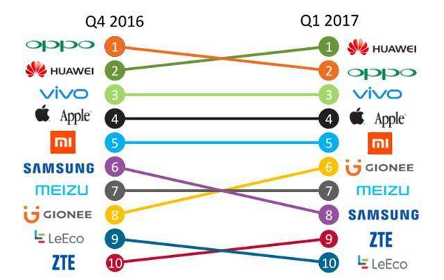 最近几年,中国市场手机销量变化颇大,国外品牌在中国似乎感觉到了增长乏力的态势,尤其苹果此前由于打赏问题,得罪了中国用户。三星自从经历了Galaxy Note 7电池爆炸,品牌形象在国内元气大伤。市场研究机构canalys近日发布了2017年第一季度中国市场手机销量,报告显示华为重返巅峰,OV大厂紧随其后,三星大退步,苹果神之迷茫。